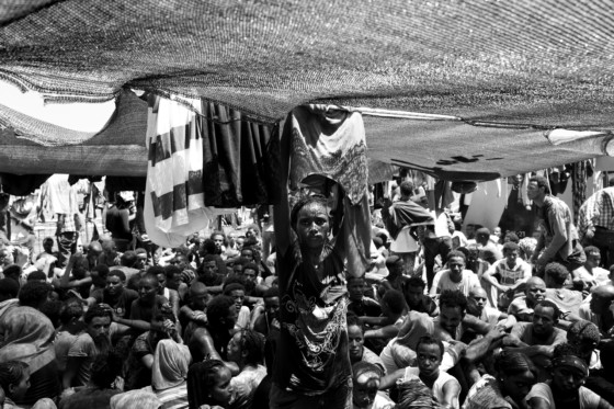 Eritrean migrants, who were rescued at sea by a ship hired by MSF. Madecines sans Frontieres, are seen on deck as the ship transports them to Reggio Calabria, Italy, on July 27, 2015. The ship, named “Bourbon Argos” , was patrolling the waters off of Libya when it encountered two wooden boats carrying a total of nearly 700 migrants, according to MSF. The migrants reported that a third boat left Libya with them, but it could not be located by MSF. It was reported to have been rescued the following day by an Irish ship, with casualties.